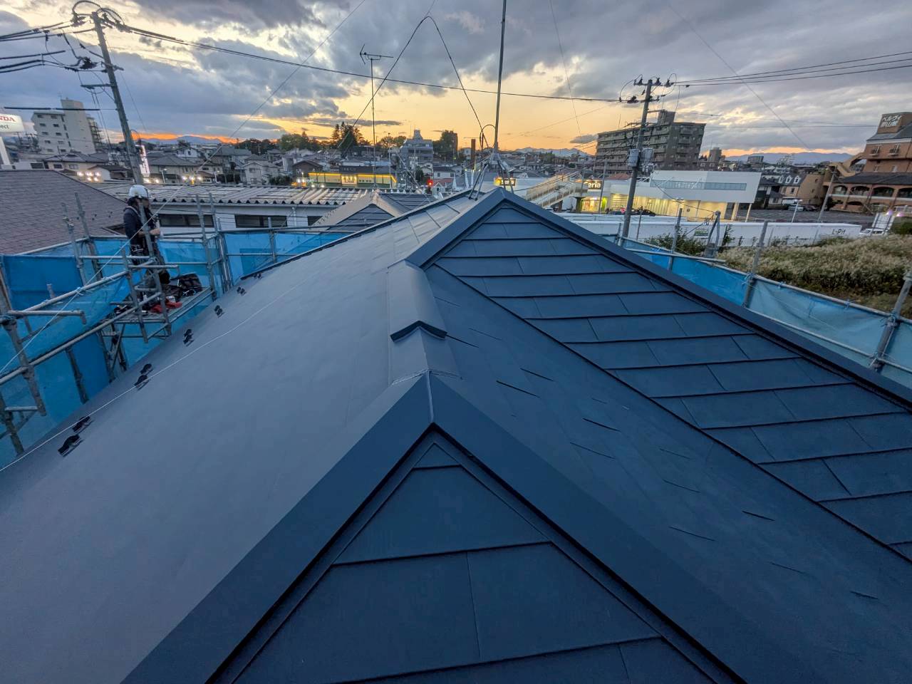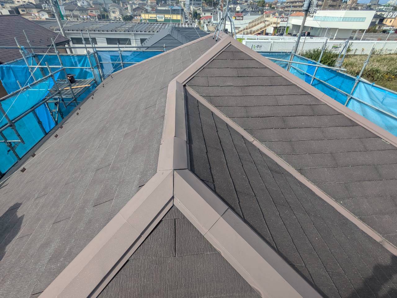 郡山市にて、既存のスレート屋根の上から新しい金属屋根を施工する「カバー工法」を行いました。劣化により苔や汚れが目立っていた屋根も、撤去せず重ね葺きすることで、コストを抑えながら断熱性・防水性・美観を一気に改善。防水シートをしっかり敷き込み、板金部材の納まりも細部まで丁寧に施工しました。最後は表面清掃を行い、光沢ある仕上がりに。工事中は飛散防止シートを設置し、安全管理も万全に対応しています。葺き替えよりも省コストで、見た目も性能も一新できるカバー工法。屋根リフォームをご検討中の方は、ぜひご相談ください。