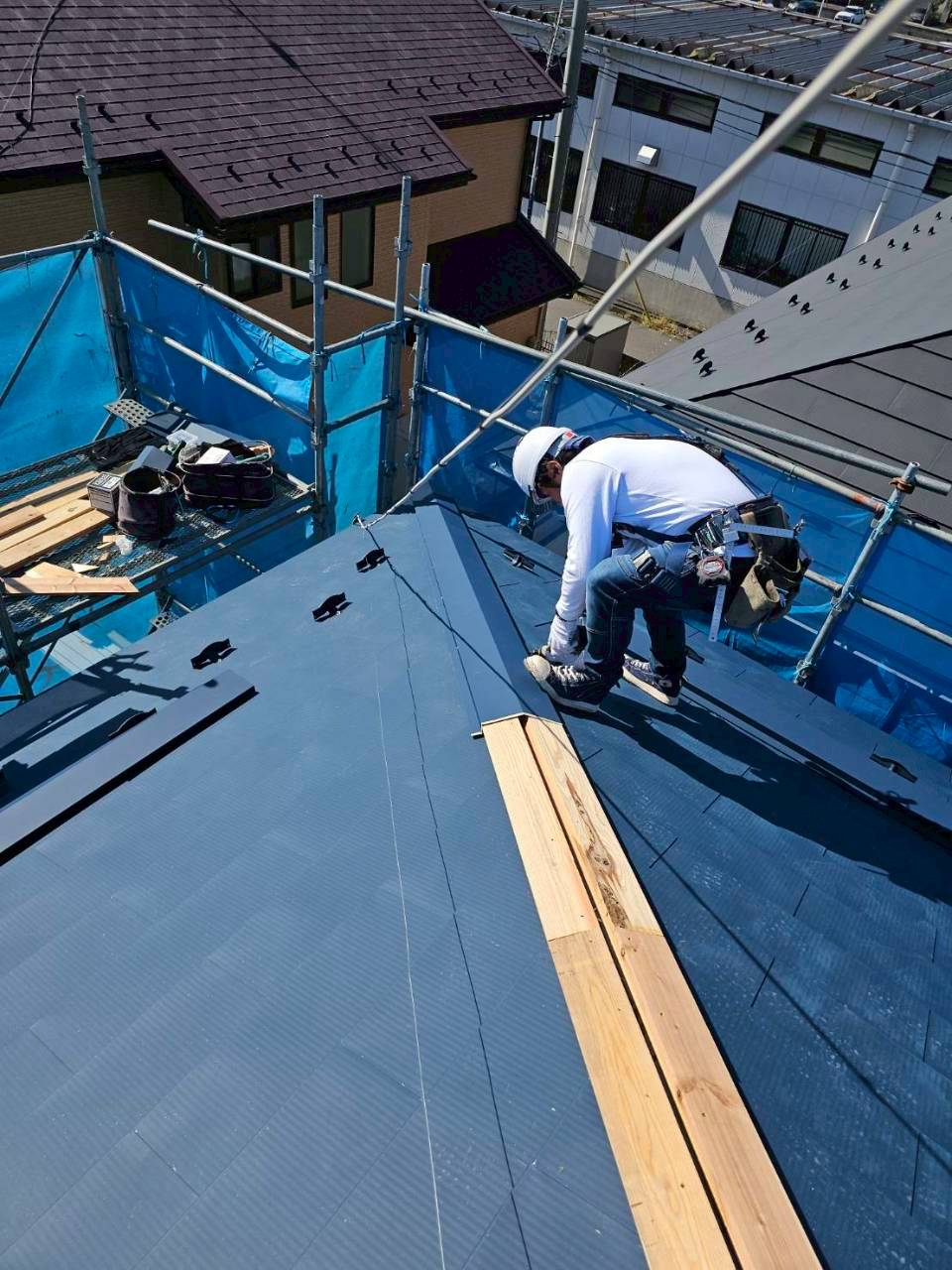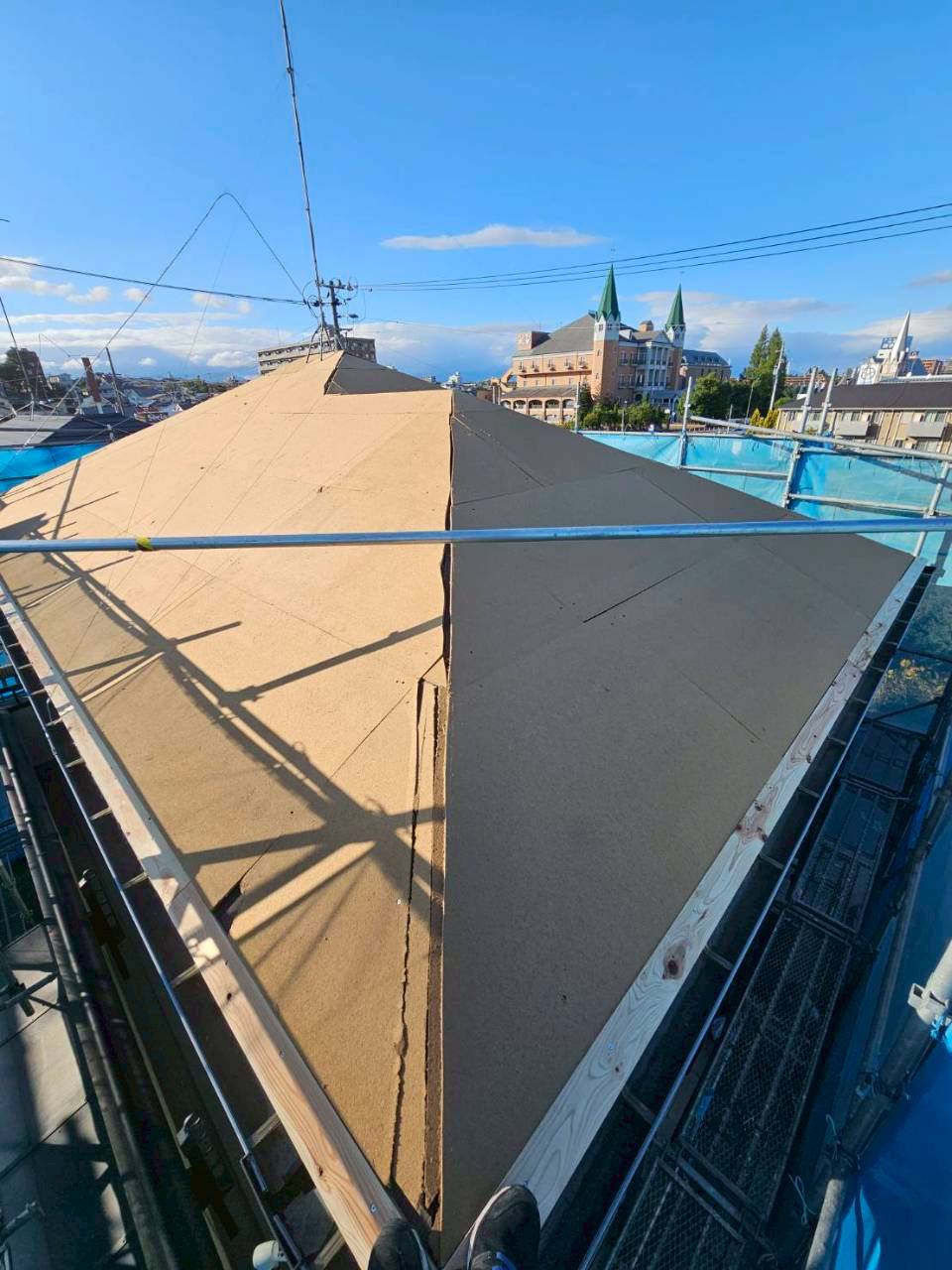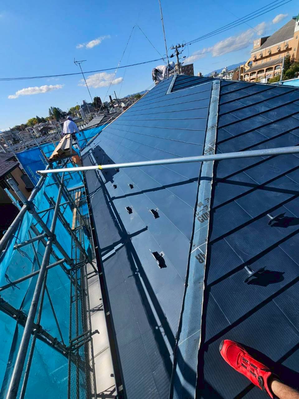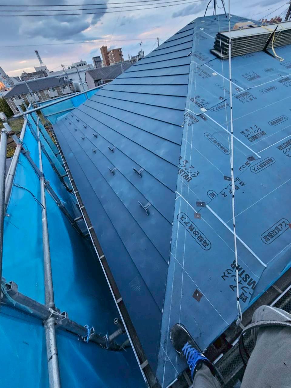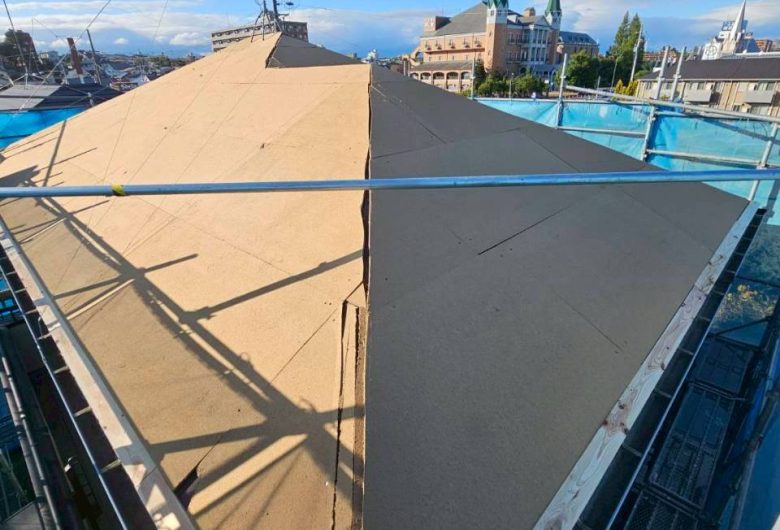 - 下地補修、防水シート設置、板金屋根のカバー施工