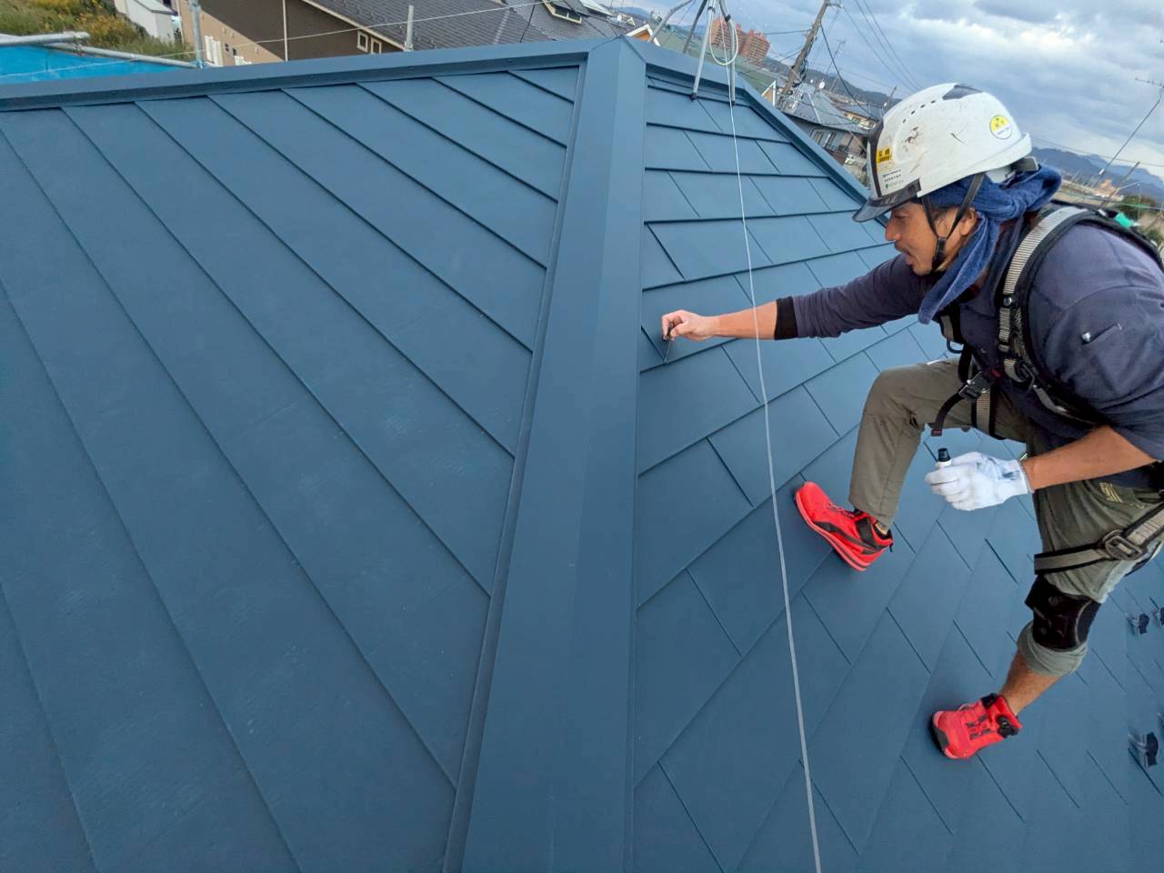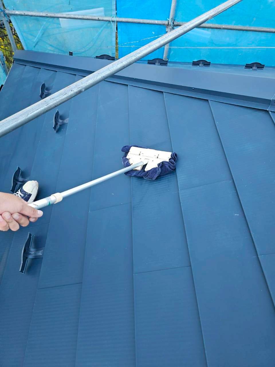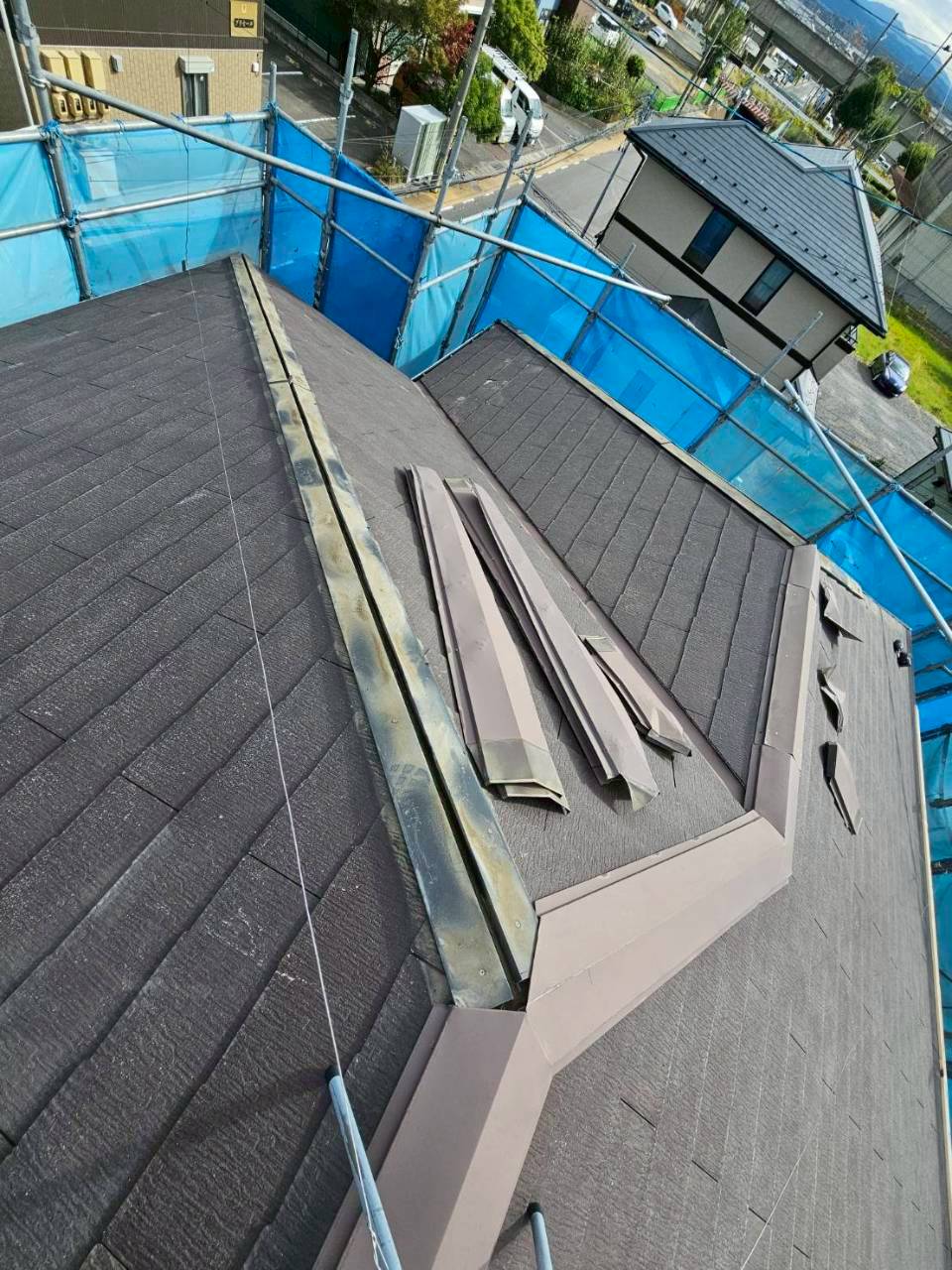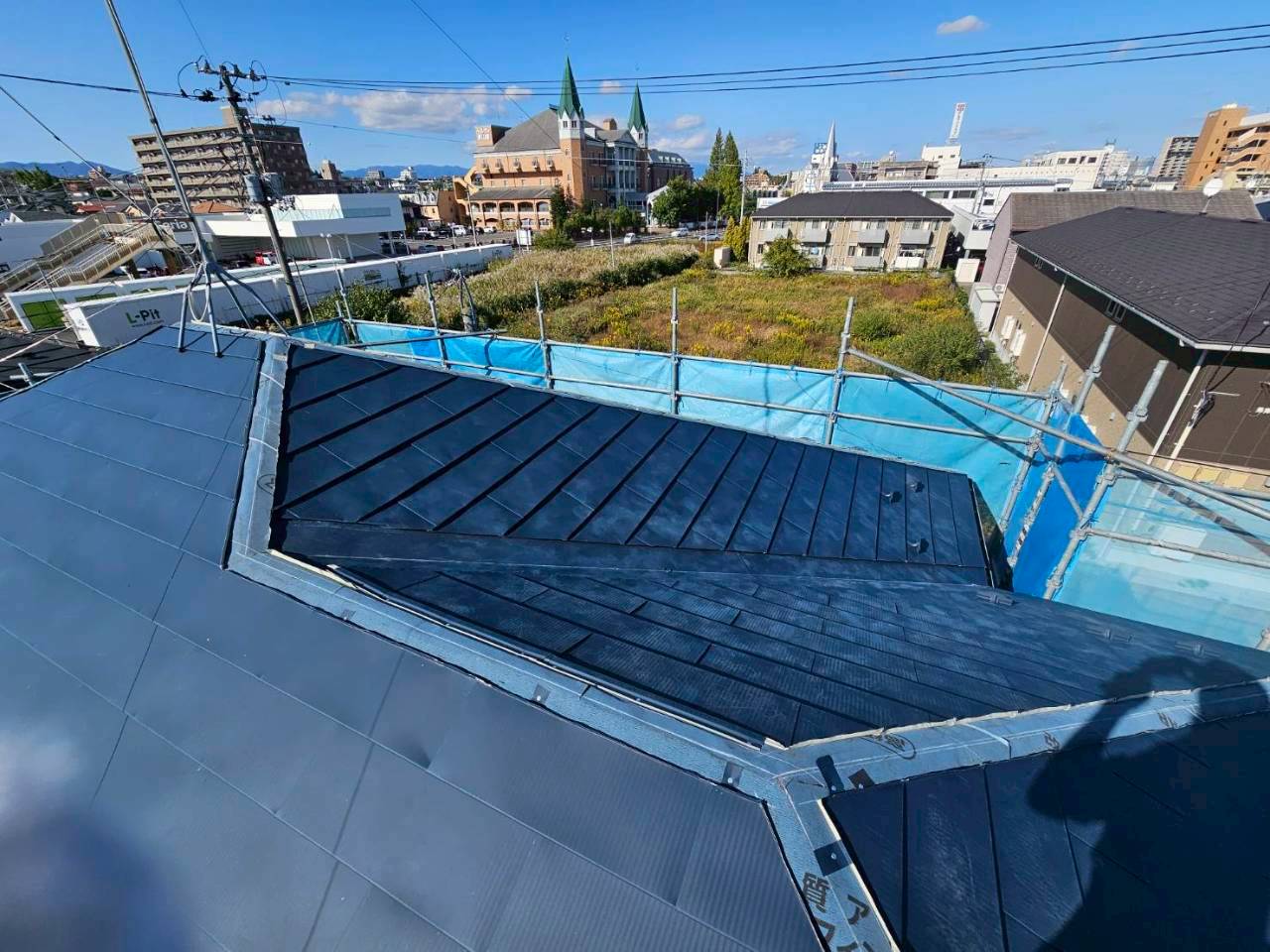 - 下地補修、防水シート設置、板金屋根のカバー施工