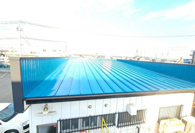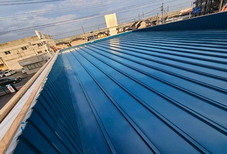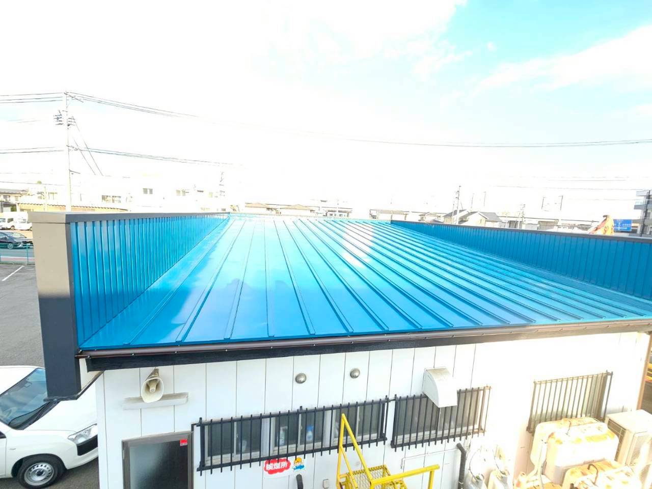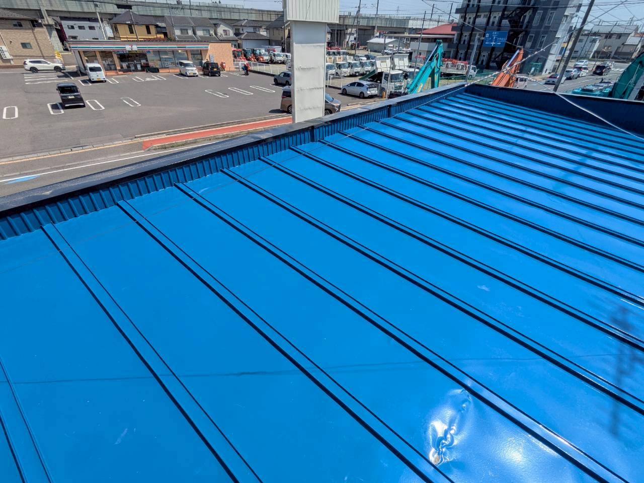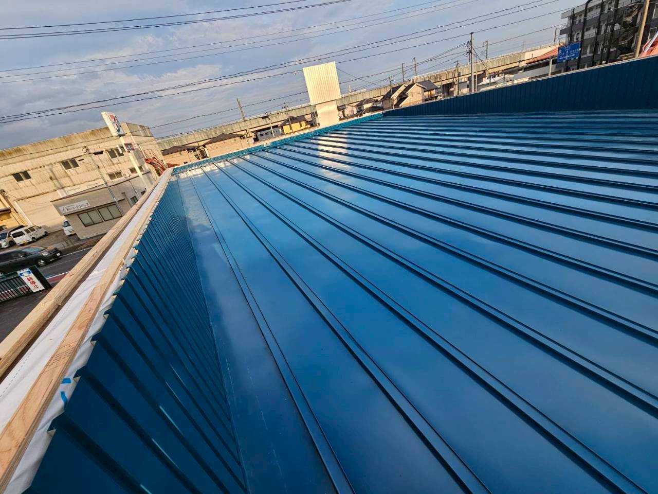 施工中は傷みが激しかった部分の下地補修を行い、板金の重ね合わせや雨仕舞も丁寧に施工。仕上げには鮮やかなブルーの金属屋根材を使用し、明るく機能的な屋根へと生まれ変わりました。