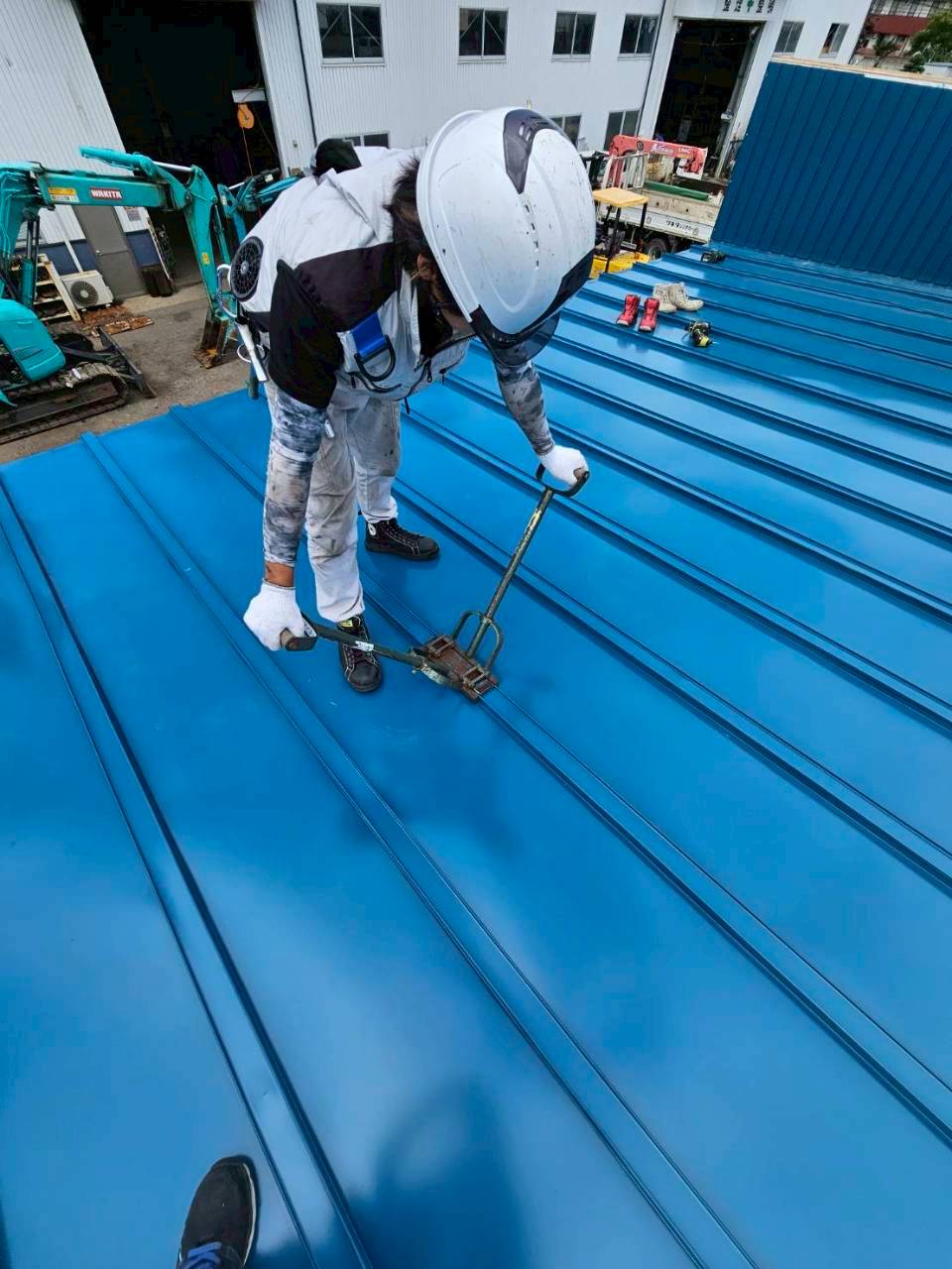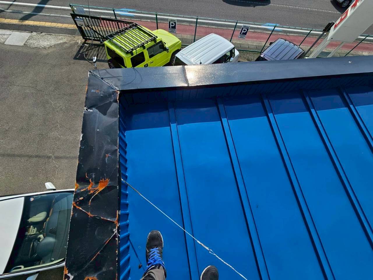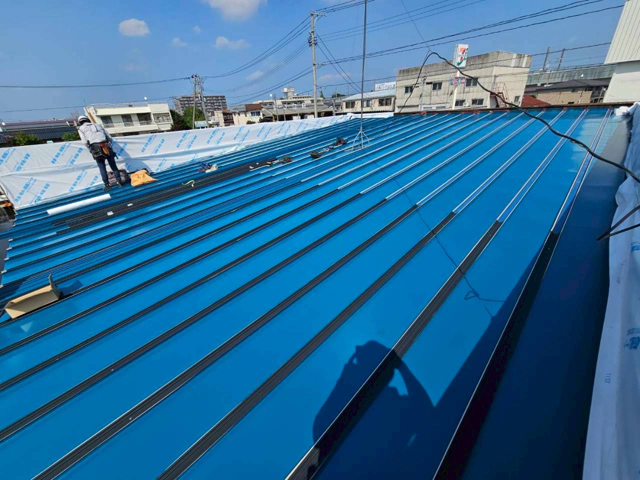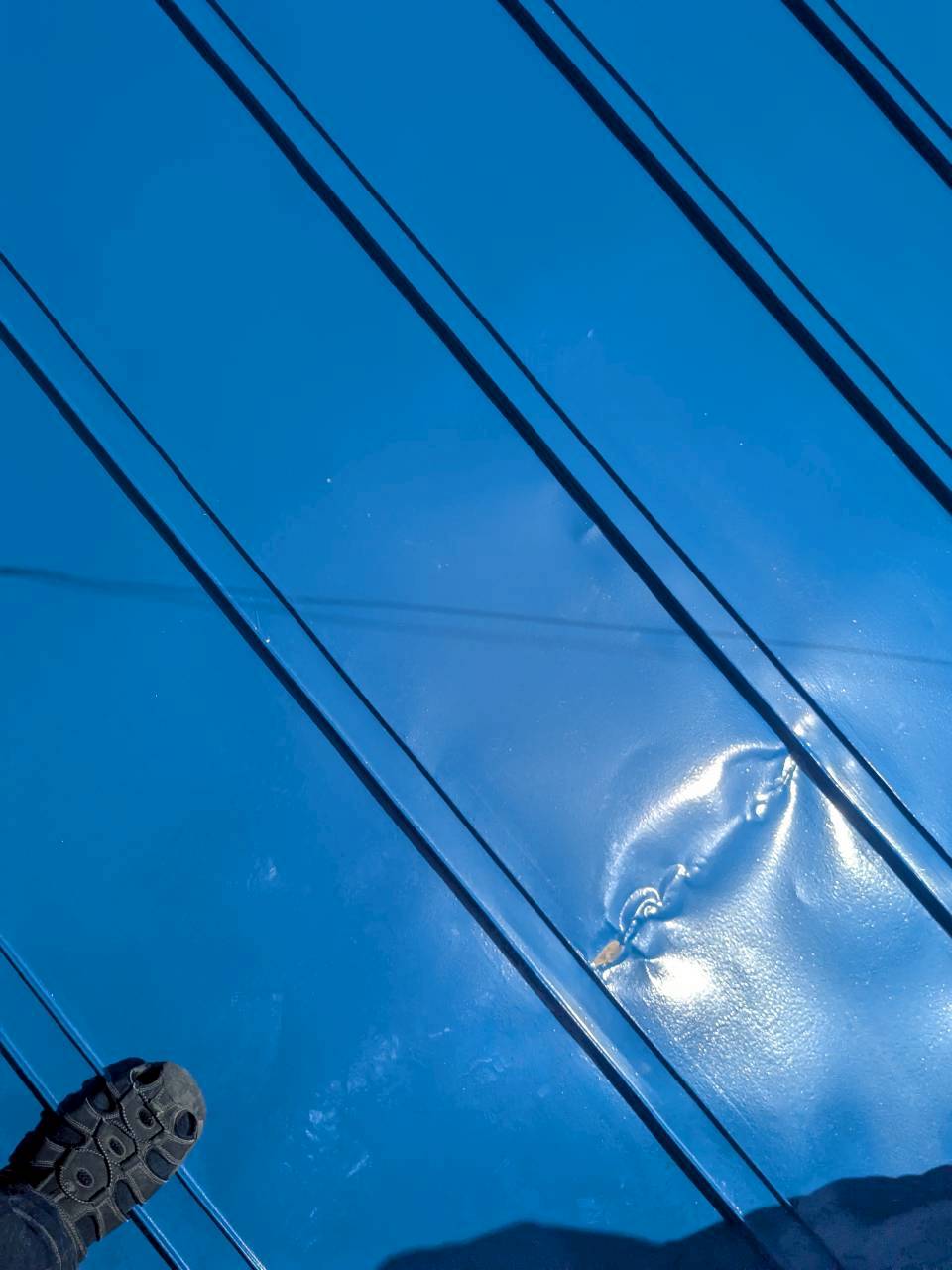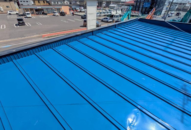 施工中は傷みが激しかった部分の下地補修を行い、板金の重ね合わせや雨仕舞も丁寧に施工。仕上げには鮮やかなブルーの金属屋根材を使用し、明るく機能的な屋根へと生まれ変わりました。