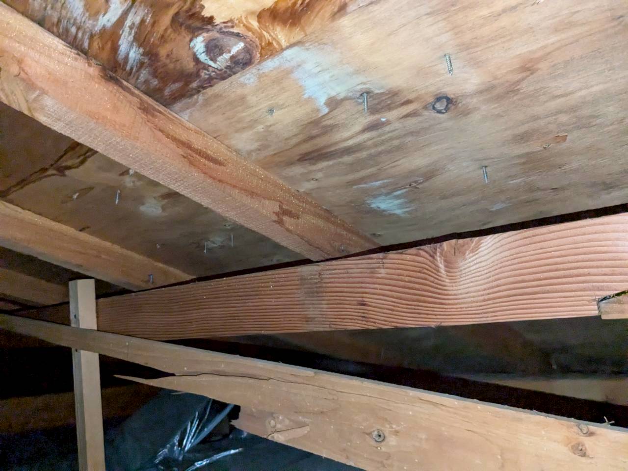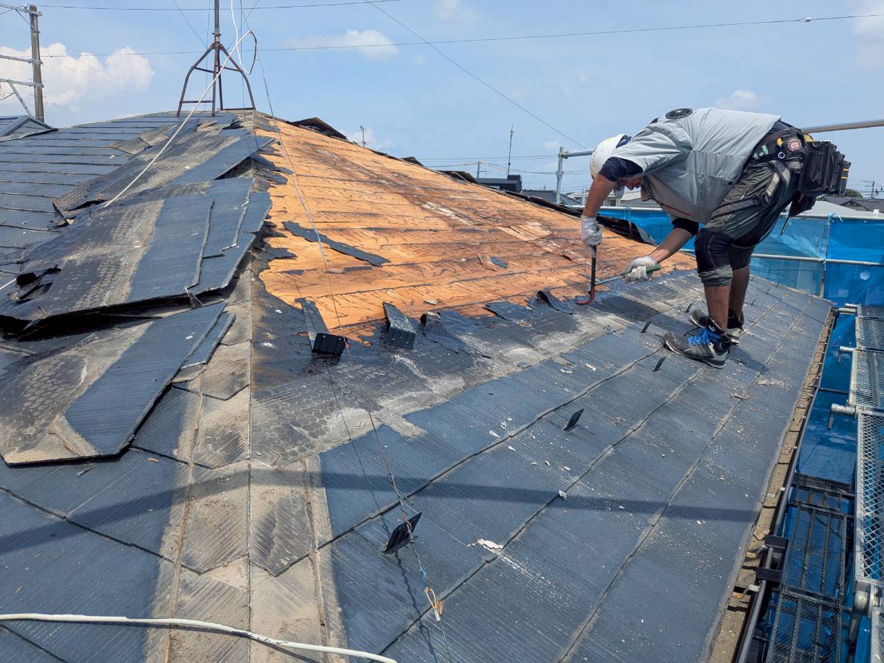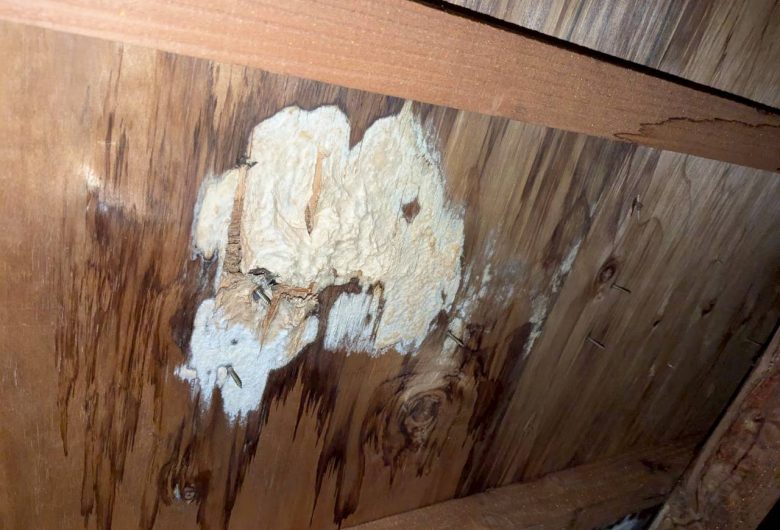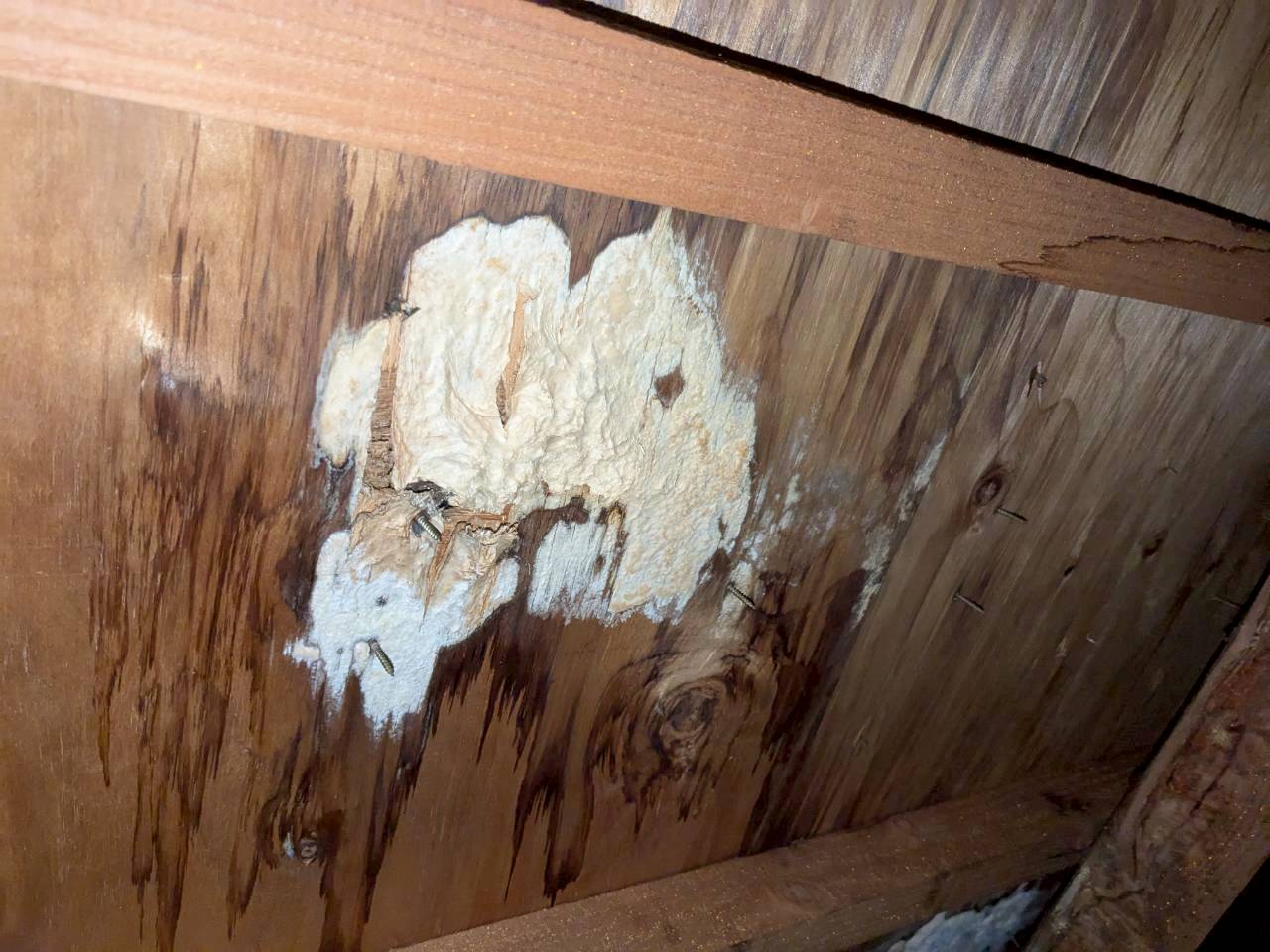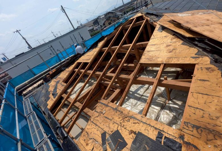 既存の屋根材をめくってみると、野地板に腐食が広がっており、天井裏にも水染みやカビが発生している状態でした。雨漏りが長期化していた可能性が高く、早急な対応が必要でした。