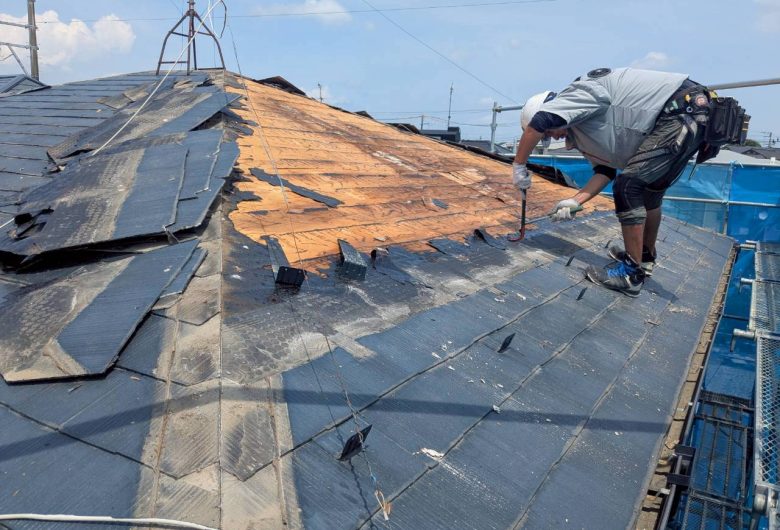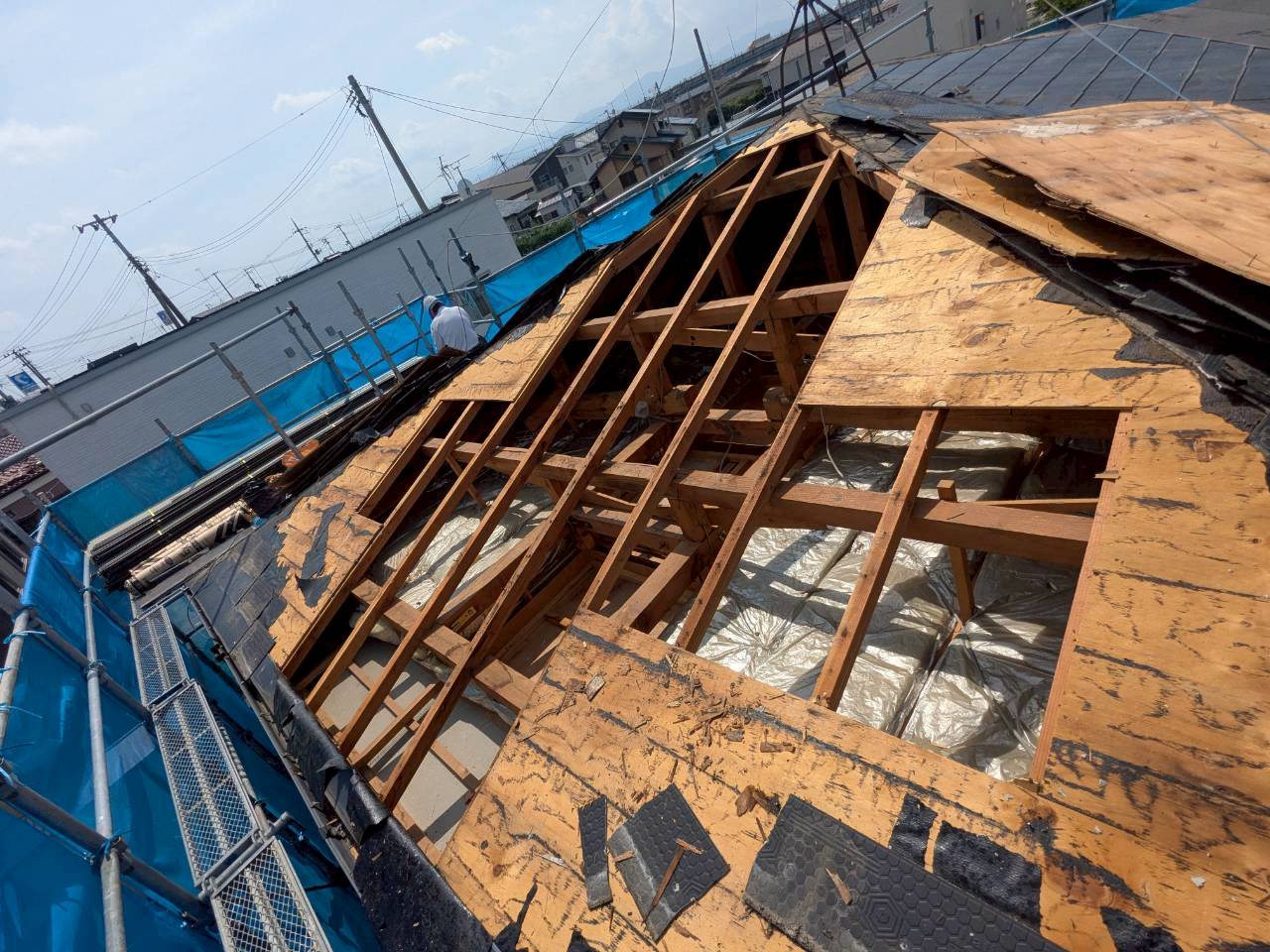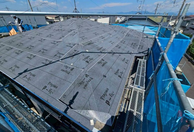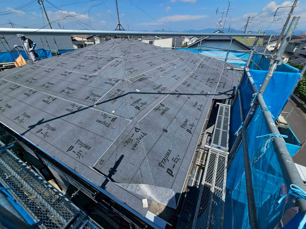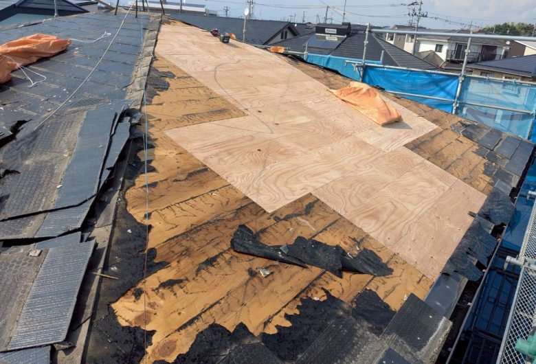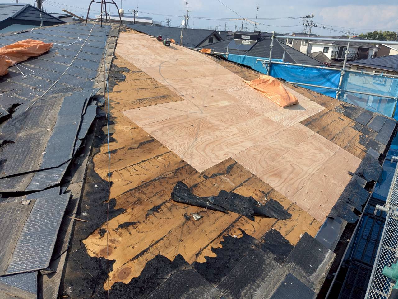 傷んだ野地板は一部を新しい合板に差し替え、屋根下地をしっかり補強。構造材の点検・補修も行った上で、防水シート(改質アスファルトルーフィング)を全面に敷設しました。